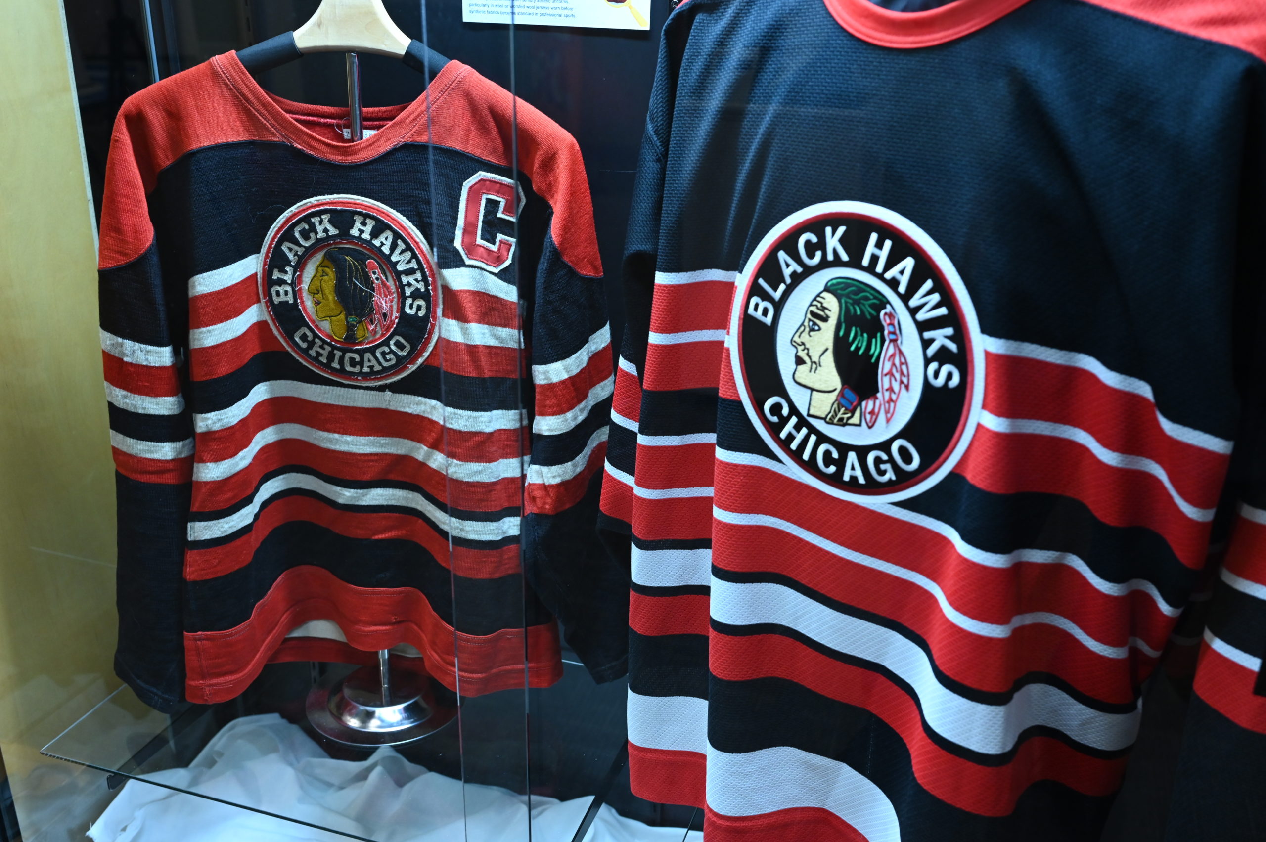 Doug Bentley’s Chicago Black Hawks jersey from his time as the team’s captain, left, beside an official reproduction of the same jersey using modern materials.