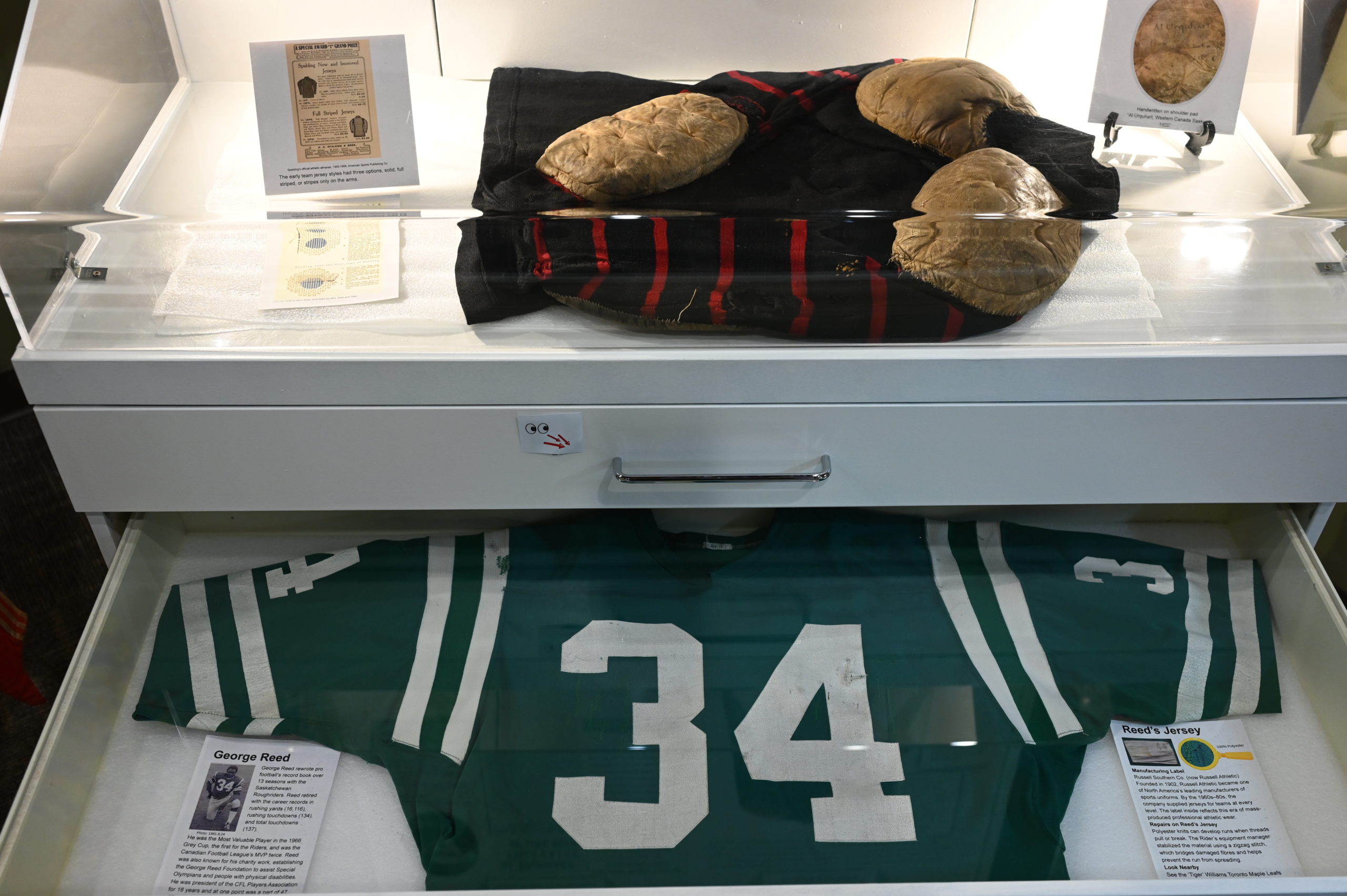 “The Sports Hall’s textile collection includes jerseys, pants/shorts, jackets, toques, hats, mitts, gloves, and shirts, each shaped by the needs of athletes in motion. For ‘On the Body: Sports, Memory and the Clothes Athletes Wore’, I’ve selected pieces with especially compelling stories. I’ve explored Al Urquhart’s jersey from the Regina Rugby Club and compared it with George Reed’s Saskatchewan Roughriders jersey,” Jensen said.